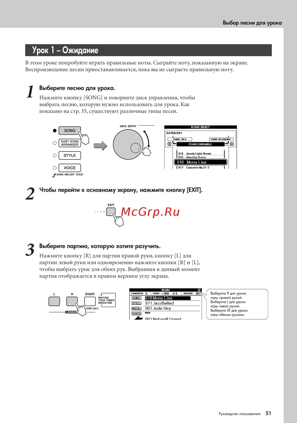 Нажмите кнопку [R] для партии правой руки, кнопку [L] для