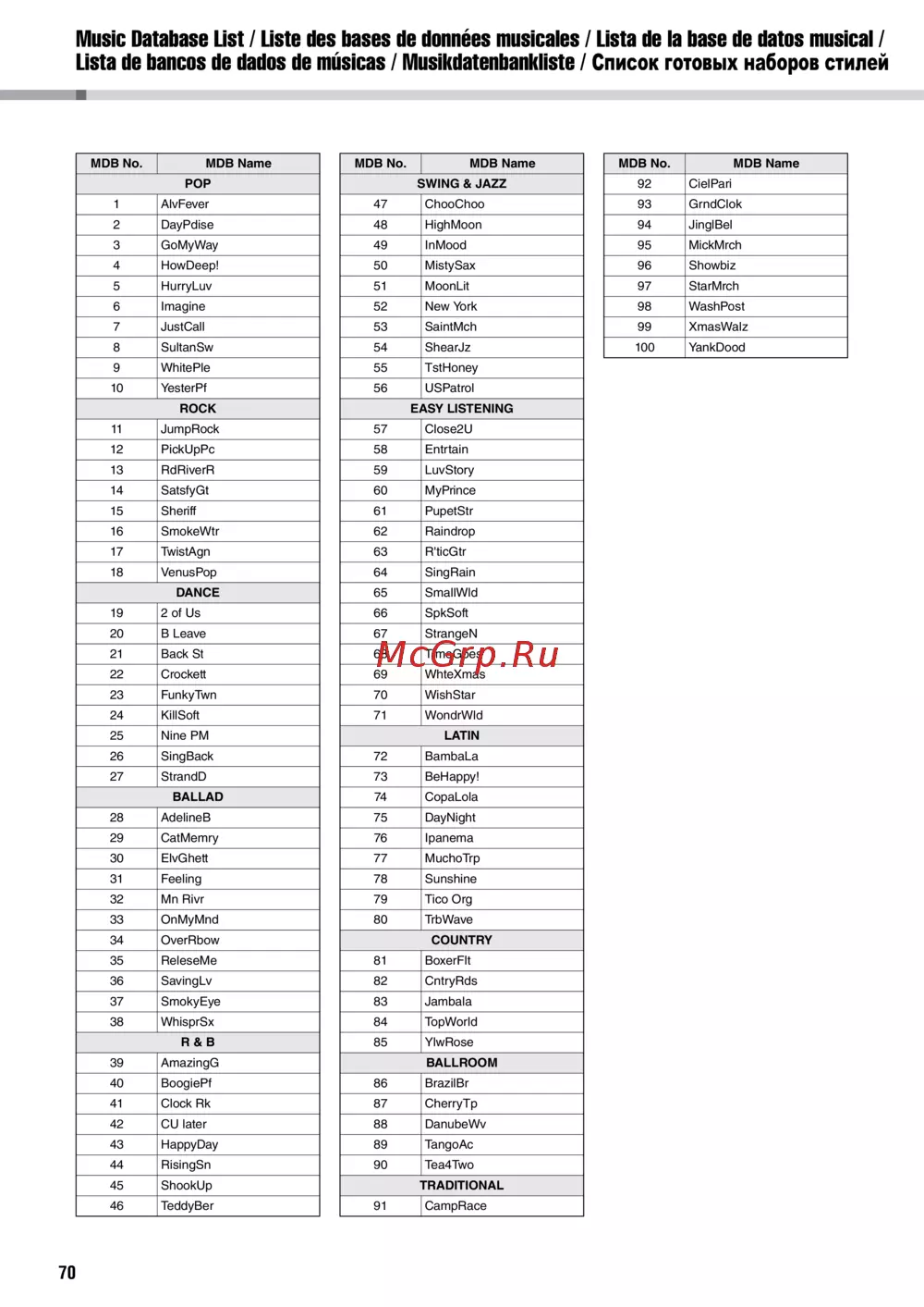 - Music database list liste des bases de données musicales lista de la base de datos musical lista de bancos de dados de músicas musikdatenbankliste список готовых наборов стилей p.70