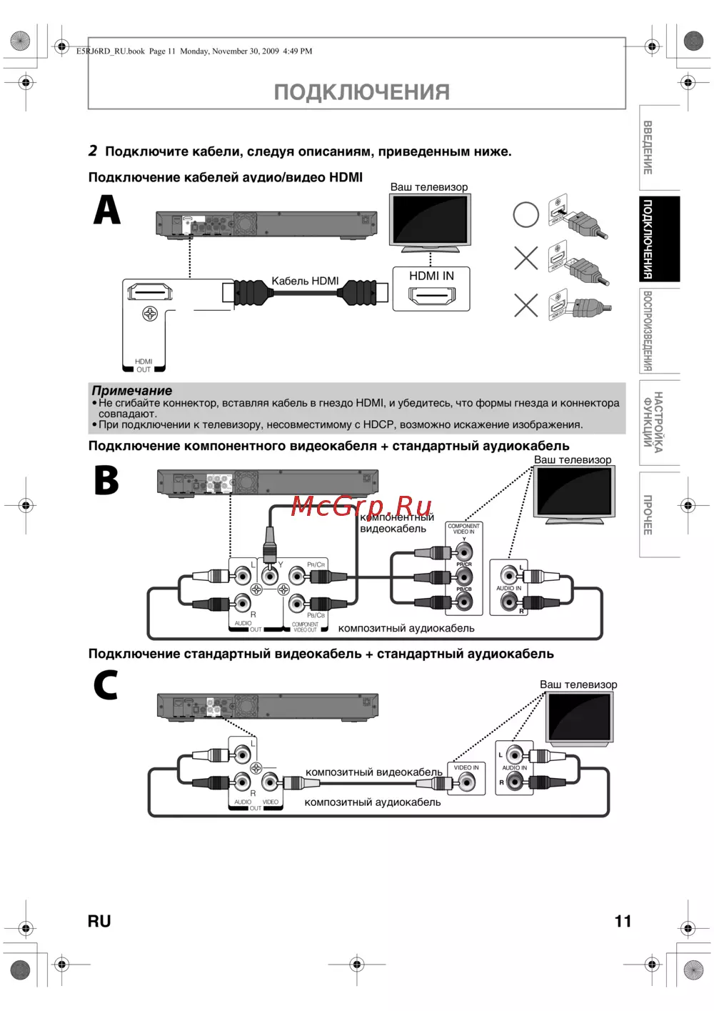 - Подключение компонентного видеокабеля стандартный аудиокабель p.11