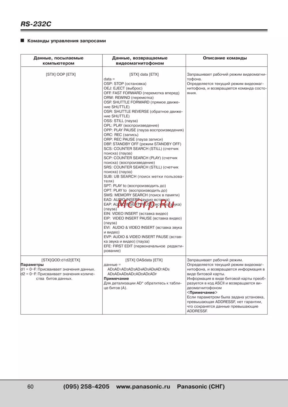 - Данные посылаемые данные возвращаемые описание команды компьютером видеомагнитофоном p.60
