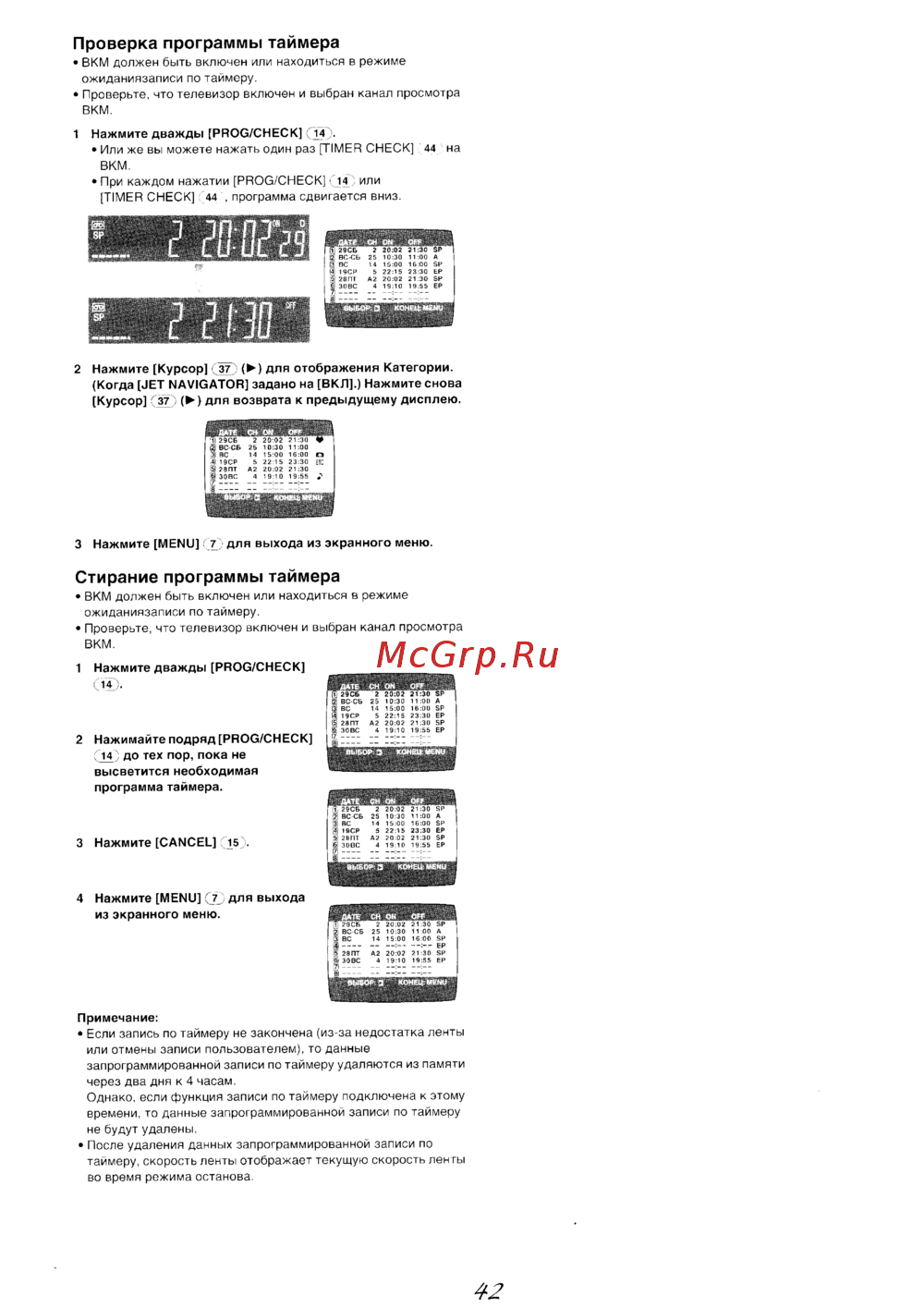 Проверка программы таймера ВКМ должен быть включен или находиться в режиме ожиданиязаписи по таймеру Проверьте что телевизор включен и выбран канал просмотра ВКМ 1 Нажмите дважды PROG CHECK Q 4 Или же вы можете нажать один раз TIMER CHECK 44 на ВКМ При каждом нажатии PROG CHECK 14 или TIMER CHECK 44 программа сдвигается вниз 2 Нажмите Курсор Ç37 для отображения Категории Когда JET NAVIGATOR задано на ВКЛ Нажмите снова Курсор Ç37 для возврата к предыдущему дисплею 3 Нажмите MENU 7 для выхода из экранного меню Стирание программы таймера ВКМ должен быть включен или находиться в режиме ожиданиязаписи по таймеру Проверьте что телевизор включен и выбран канал просмотра ВКМ 1 Нажмите дважды PROG CHECK Í4j 2 Нажимайте подряд РВОС СНЕСК 04 до тех пор пока не высветится необходимая программа таймера ен ON О TF 2 20 02 25 10 30 14 15 00 5 22 1 5 А2 20 02 4 19 10 11 00 А 16 00 SP 23 30 ЕР 21 30 SP 19 55 ЕР 3 Нажмите CANCEL 15 4 Нажмите MENU Jj для выхода из экранного меню Примечание Если запись по таймеру не закончена из за недостатка ленты или отмены записи пользователем то данные запрограммированной записи по таймеру удаляются из памяти через два дня к 4 часам Однако если функция записи по таймеру подключена к этому времени то данные запрограммированной записи по таймеру не будут удалены После удаления данных запрограммированной записи по таймеру скорость ленты отображает текущую скорость ленты во время режима останова 42