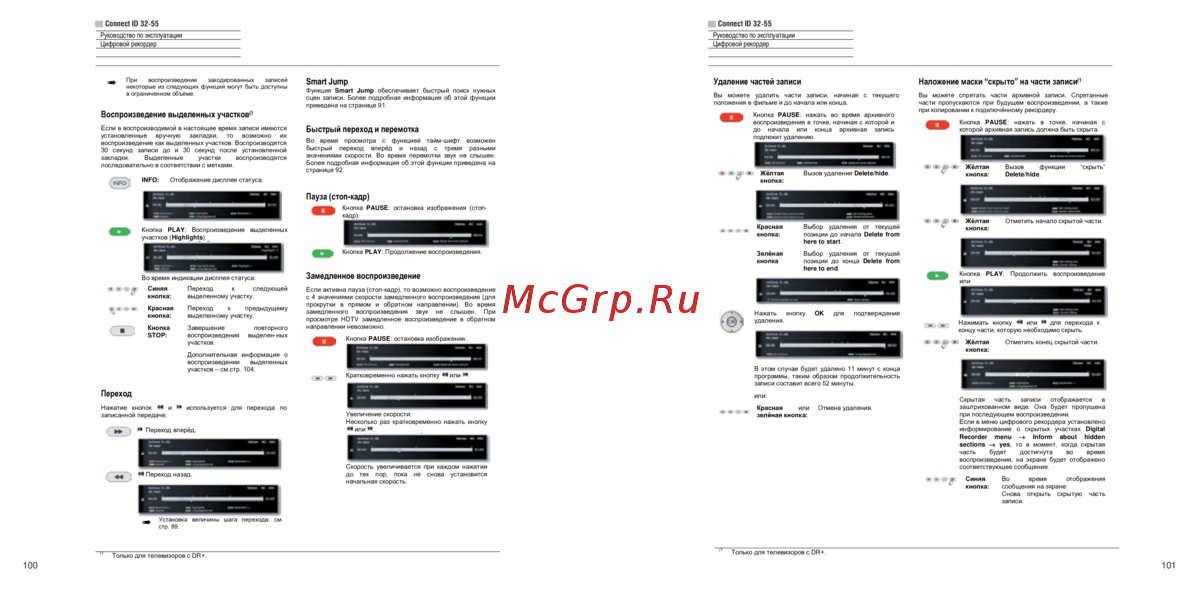 Изучите функции воспроизведения и управления цифровым рекордером. Узнайте о выделенных участках, паузе, замедленном воспроизведении и быстром переходе.