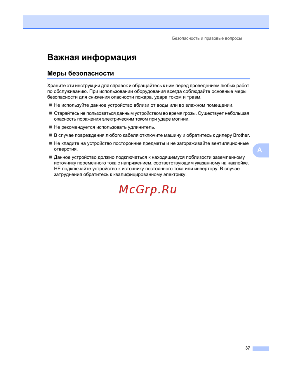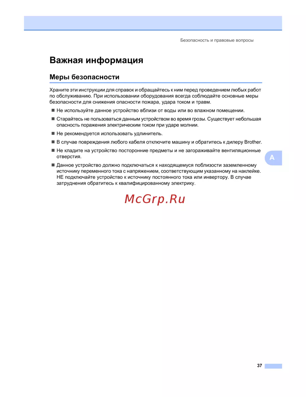 Brother DCP-7030R — основные меры безопасности при использовании оборудования [43/107]