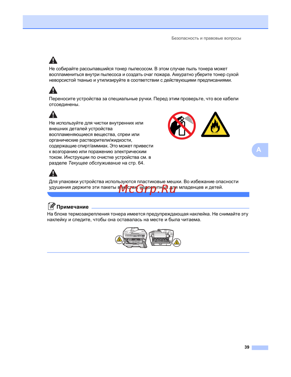 Brother DCP-7030R — безопасность и обслуживание принтера: инструкции и предупреждения [45/107]