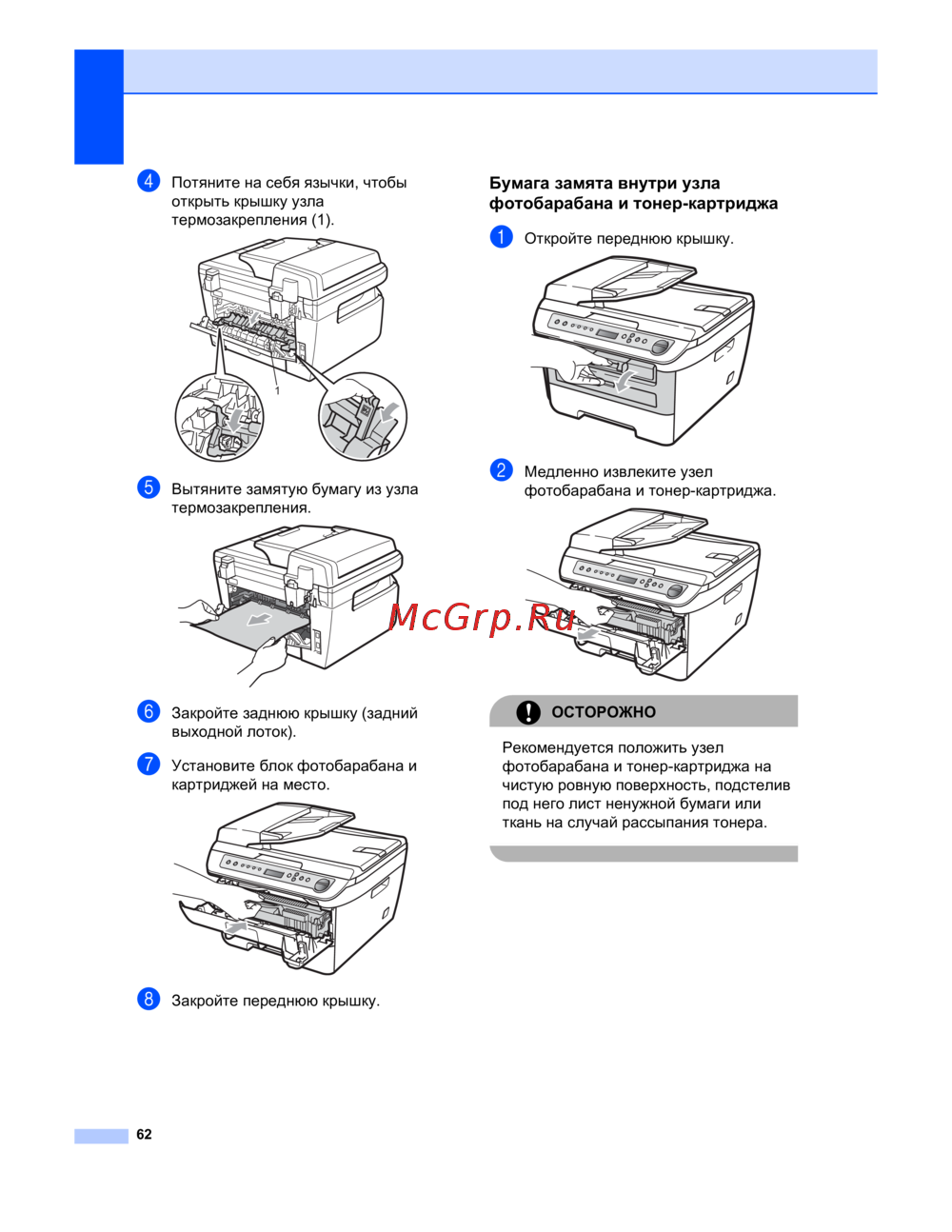 - Бумага замята внутри узла фотобарабана и тонер картриджа p.68