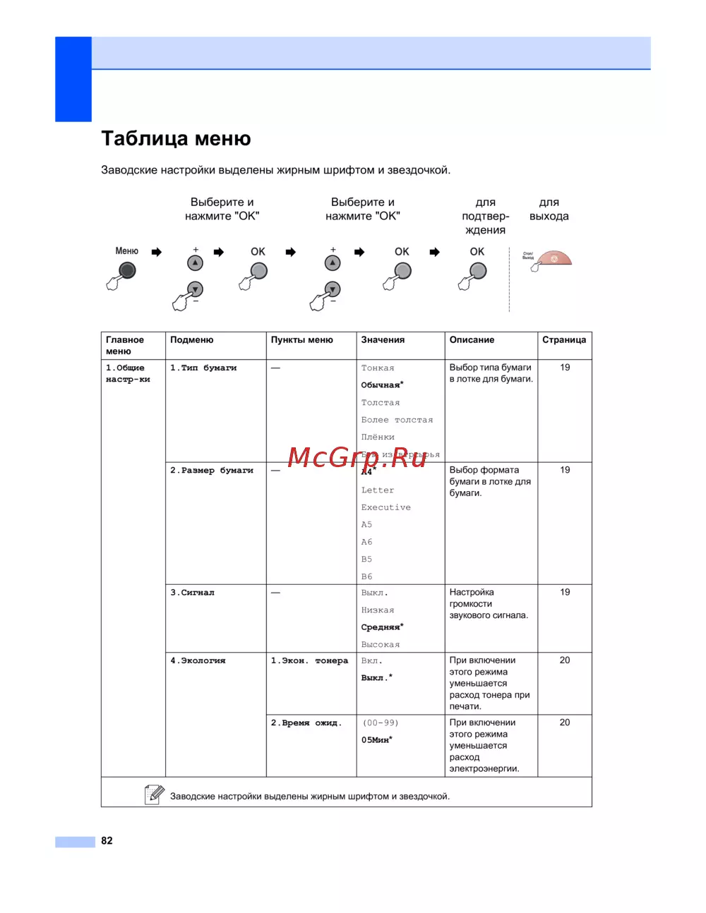 Заводские настройки выделены жирным шрифтом и звездочкой.