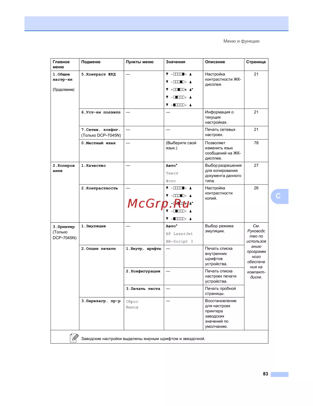 Brother DCP-7030R — настройки принтера: меню, копирование, сетевая конфигурация и управление дисплеем [89/107]