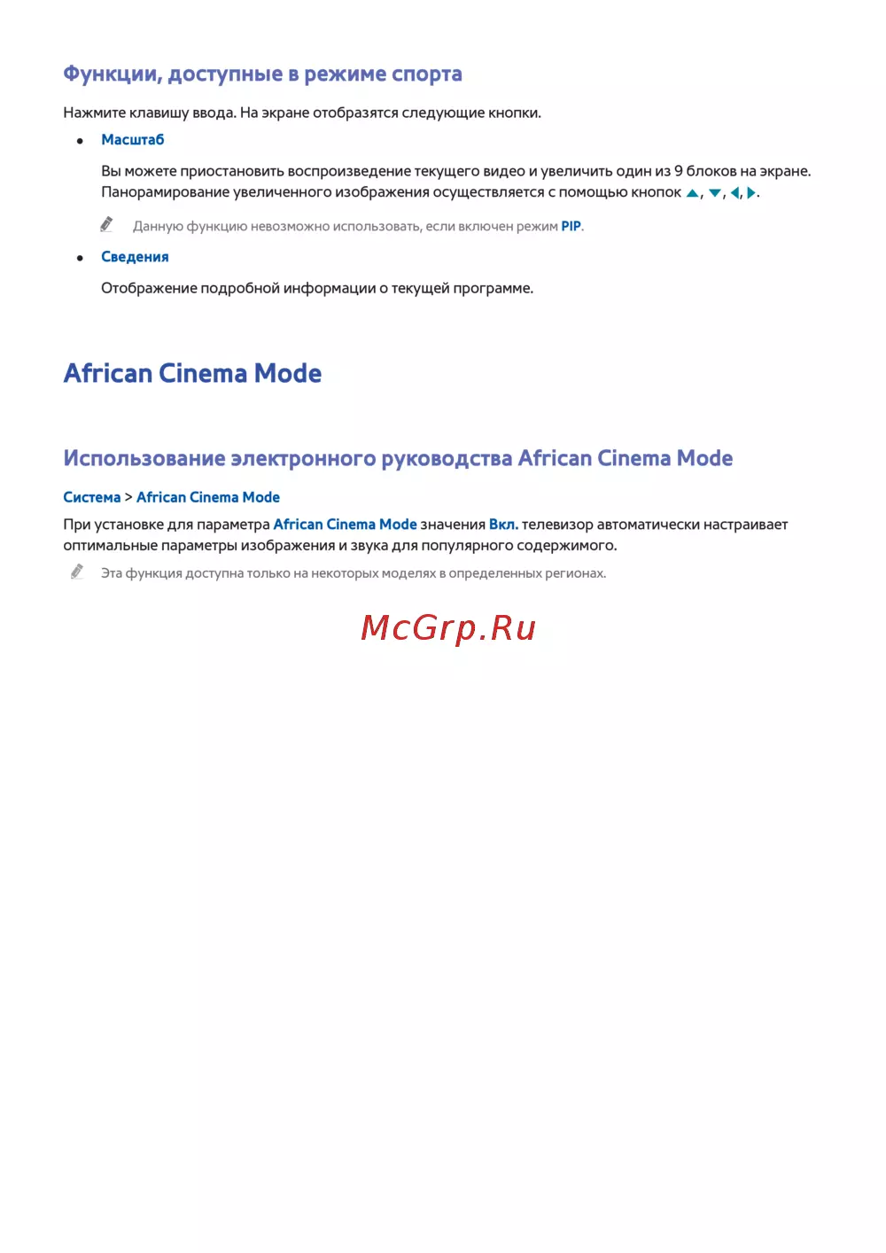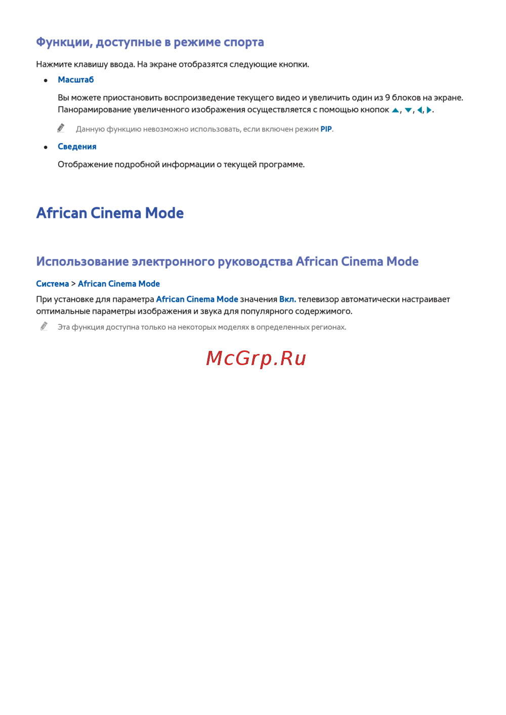 При установке для параметра African Cinema Mode значения Вкл. телевизор автоматически настраивает