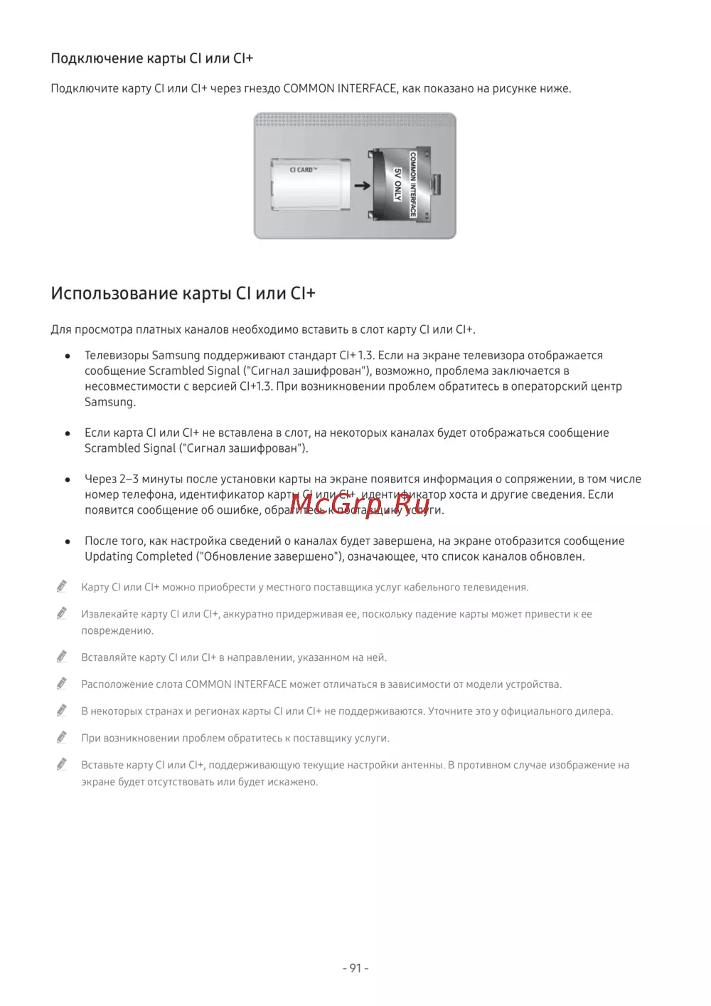 ● Телевизоры Samsung поддерживают стандарт CI+ 1.3. Если на экране телевизора отображается