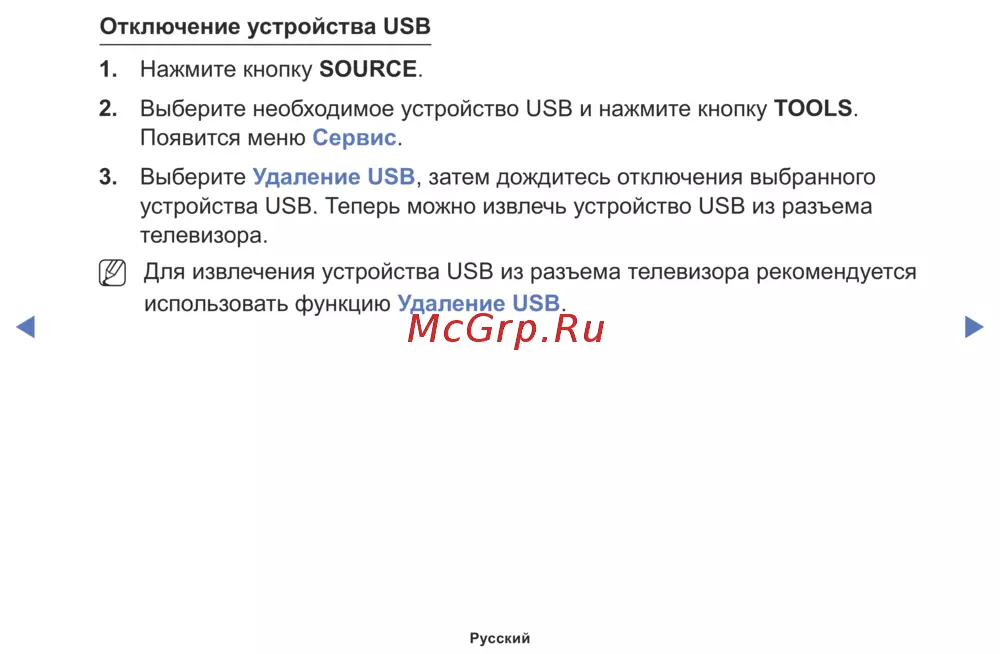 Для извлечения устройства USB из разъема телевизора рекомендуется