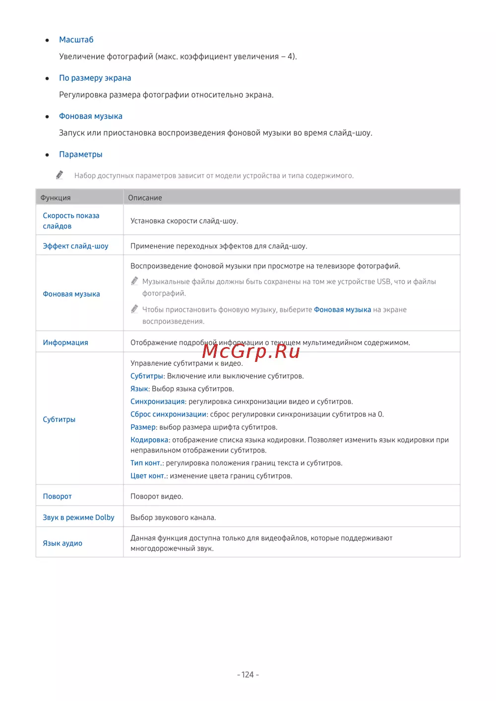 " Набор доступных параметров зависит от модели устройства и типа содержимого.