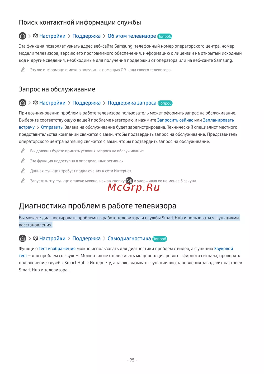 Вы можете диагностировать проблемы в работе телевизора и службы Smart Hub и пользоваться функциями