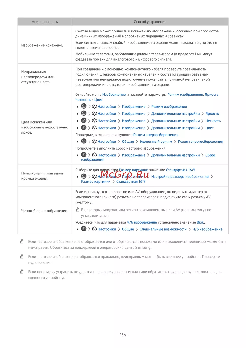 " Если тестовое изображение не отображается или отображается с помехами или искажением, телевизор может быть