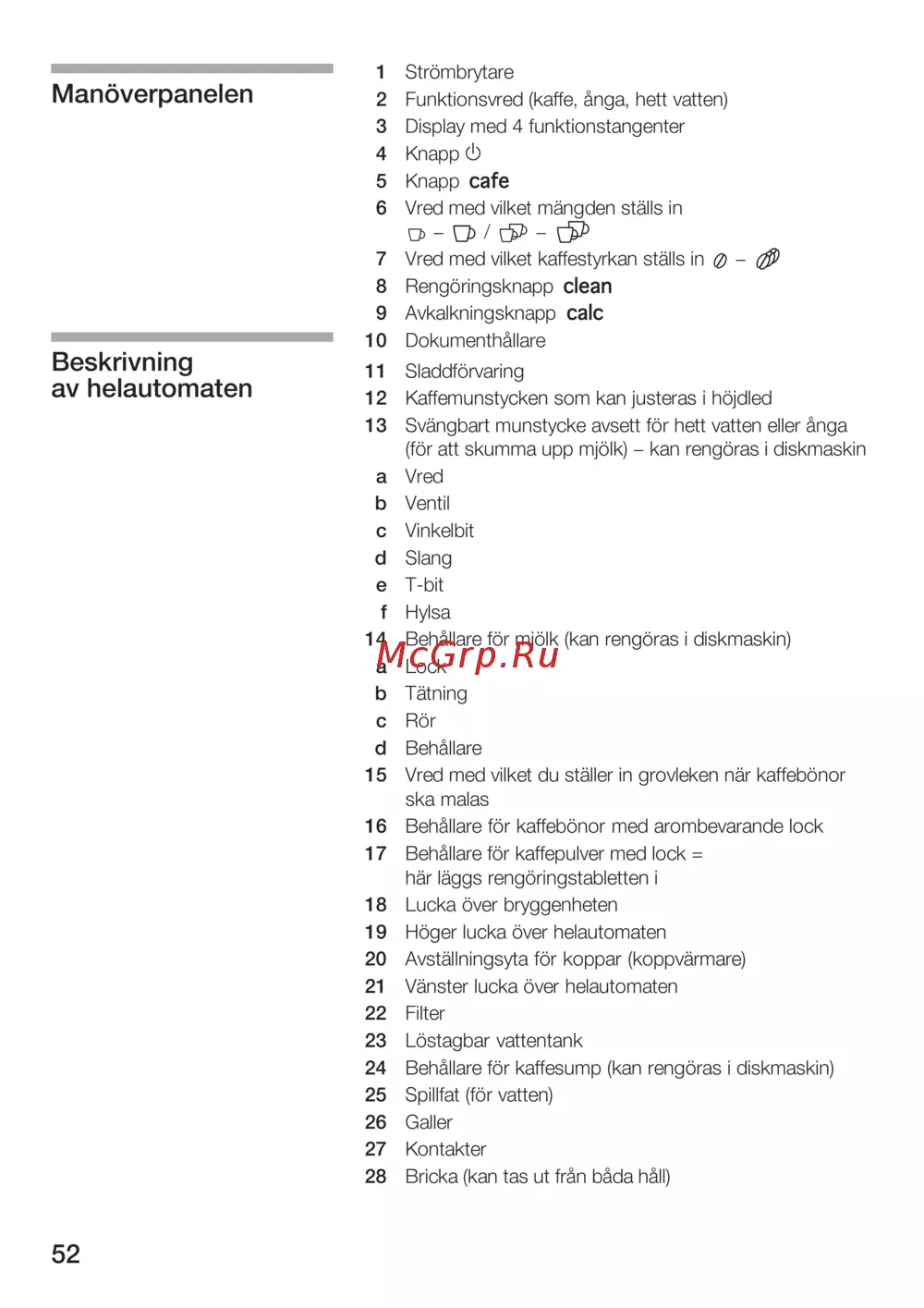 Manoverpanelen Beskrivning av helautomaten 1 Strdmbrytare 2 Funktionsvred kaffe anga hett vatten 3 Display med 4 funktionstangenter 4 Knapp 5 Knapp cafe 6 Vred med vilket mangden stalls in 7 Vred med vilket kaffestyrkan stalls in 0 8 Rengbringsknapp clean 9 Avkalkningsknapp calc 10 Dokumenthallare 11 Sladdfbrvaring 12 Kaffemunstycken som kan justeras i hbjdled 13 Svangbart munstycke avsett for hett vatten eller anga for att skumma upp mjblk kan rengbras i diskmaskin a Vred b Ventil c Vinkelbit d Slang e T bit f Hylsa 14 52 Behallare for mjblk kan rengbras i diskmaskin a Lock b Tatning c Rbr d Behallare 15 Vred med vilket du staller in grovleken nar kaffebbnor ska malas 16 Behallare for kaffebbnor med arombevarande lock 17 Behallare for kaffepulver med lock har laggs rengbringstabletten i 18 Lucka over bryggenheten 19 Hbger lucka over helautomaten 20 Avstallningsyta for koppar koppvarmare 21 Vanster lucka over helautomaten 22 Filter 23 Lbstagbar vattentank 24 Behallare for kaffesump kan rengbras i diskmaskin 25 Spillfat for vatten 26 Galler 27 Kontakter 28 Bricka kan tas ut fran bada hall