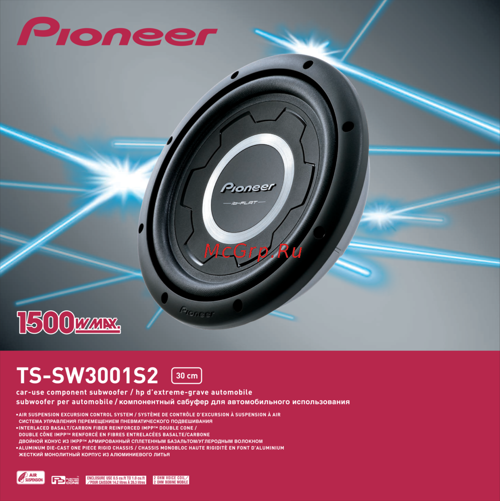 Pioneer TS SW3001S2 В car use component subwoofer hp d extreme grave automobile subwoofer per automobile компонентный сабуфер для автомобильного использования AIR SUSPENSION EXCURSION CONTROL SYSTEM SYSTÈME DE CONTRÔLE D EXCURSION À SUSPENSION À AIR СИСТЕМА УПРАВЛЕНИЯ ПЕРЕМЕЩЕНИЕМ ПНЕВМАТИЧЕСКОГО ПОДВЕШИВАНИЯ INTERLACED BASALT CARBON FIBER REINFORCED IMPP DOUBLE CONE DOUBLE CÔNE IMPP RENFORCÉ EN FIBRES ENTRELACÉES BASALTE CARBONE ДВОЙНОЙ КОНУС ИЗ IMPP АРМИРОВАННЫЙ СПЛЕТЕННЫМ БАЗАЛЬТОМ УГЛЕРОДНЫМ ВОЛОКНОМ ALUMINUM DIE CAST ONE PIECE RIGID CHASSIS CHASSIS MONOBLOC HAUTE RIGIDITÉ EN FONT D ALUMINIUM ЖЕСТКИЙ МОНОЛИТНЫЙ КОРПУС ИЗ АЛЮМИНИЕВОГО ЛИТЬЯ У AIR SUSPENSION TM INJECTION MOLDED CONE ENCLOSURE USE 0 5 cu ft TO 1 0 cu ft POUR CAISSON 14 2 litres À 28 3 litres 2 OHM VOICE COIL 2 OHM BOBINE MOBILE
