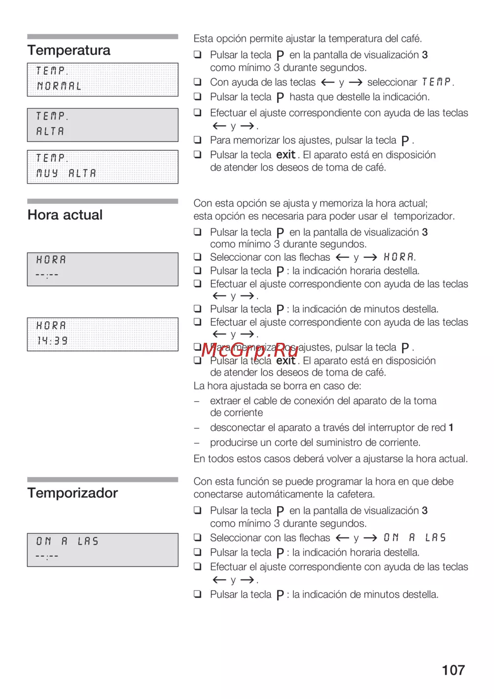 Esta opción permite ajustar la temperatura del café Temperatura T E n p Pulsar la tecla p en la pantalla de visualización 3 como mínimo 3 durante segundos HORfiñL Con ayuda de las teclas y seleccionar T E H P Pulsar la tecla p hasta que destelle la indicación Efectuar el ajuste correspondiente con ayuda de las teclas y TERP RLTR Para memorizar los ajustes pulsar la tecla p TERP fJUy RLTR Hora actual Pulsar la tecla exit El aparato está en disposición de atender los deseos de toma de café Con esta opción se ajusta y memoriza la hora actual esta opción es necesaria para poder usar el temporizador Pulsar la tecla p en la pantalla de visualización 3 como mínimo 3 durante segundos Seleccionar con las flechas y HDRR Pulsar la tecla p la indicación horaria destella Efectuar el ajuste correspondiente con ayuda de las teclas Pulsar la tecla p la indicación de minutos destella Efectuar el ajuste correspondiente con ayuda de las teclas Para memorizar los ajustes pulsar la tecla p Pulsar la tecla exit El aparato está en disposición de atender los deseos de toma de café La hora ajustada se borra en caso de extraer el cable de conexión del aparato de la toma de corriente desconectar el aparato a través del interruptor de red 1 producirse un corte del suministro de corriente En todos estos casos deberá volver a ajustarse la hora actual Temporizador Con esta función se puede programar la hora en que debe conectarse automáticamente la cafetera Pulsar la tecla p en la pantalla de visualización 3 como mínimo 3 durante segundos OH R LRS Seleccionar con las flechas y 0 TI R LRS Pulsar la tecla p la indicación horaria destella Efectuar el ajuste correspondiente con ayuda de las teclas y Pulsar la tecla p la indicación de minutos destella 107