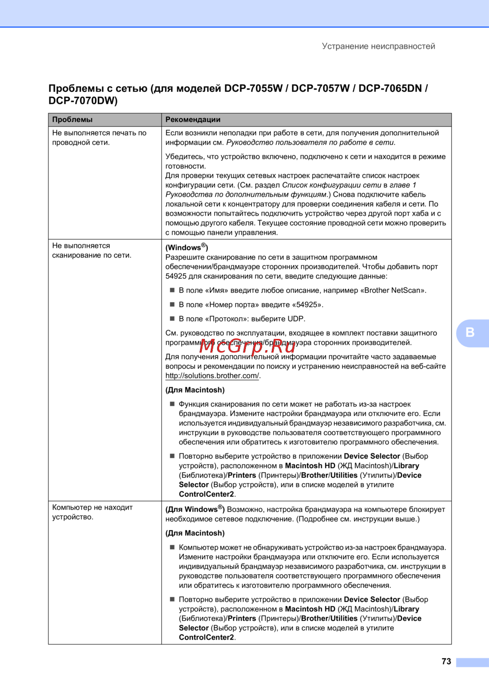 - Проблемы с сетью для моделей dcp 7055w dcp 7057w dcp 7065dn dcp 7070dw p.81