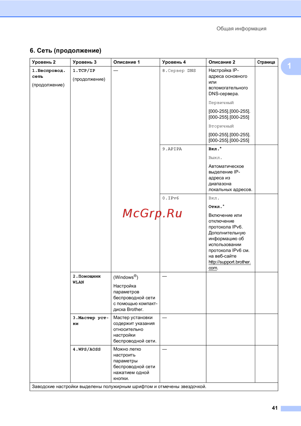 Заводские настройки выделены полужирным шрифтом и отмечены звездочкой.