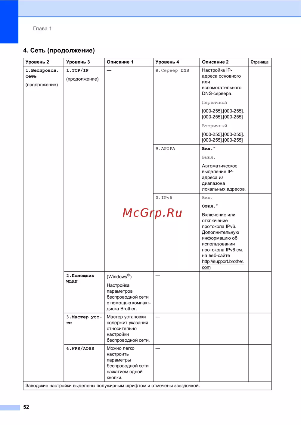 Заводские настройки выделены полужирным шрифтом и отмечены звездочкой.