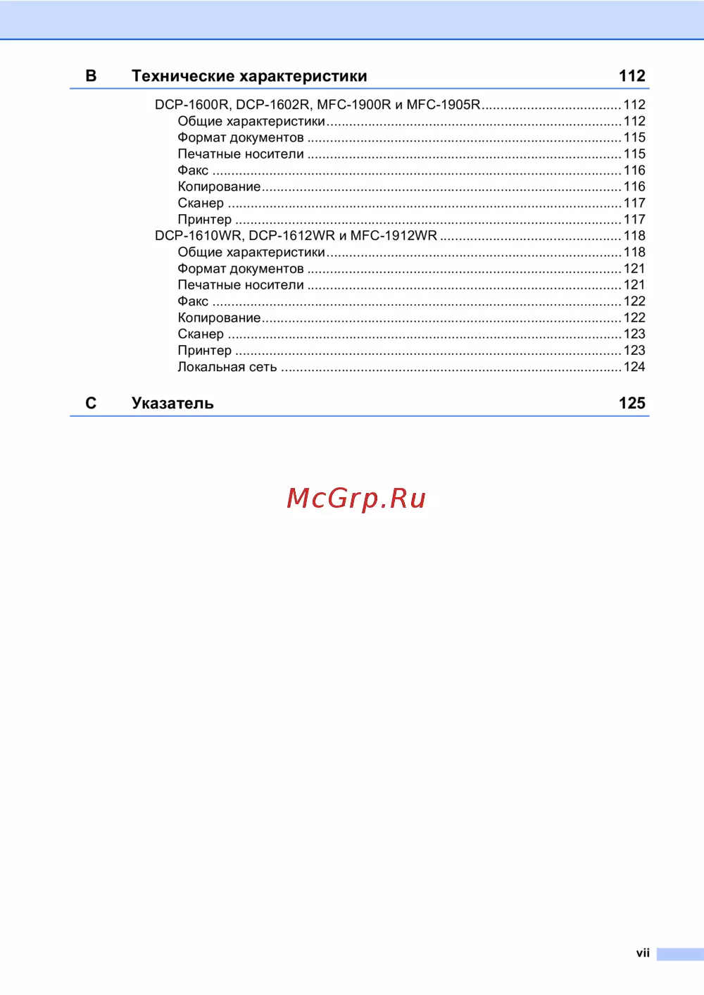 DCP-1600R, DCP-1602R, MFC-1900R и MFC-1905R.....................................112