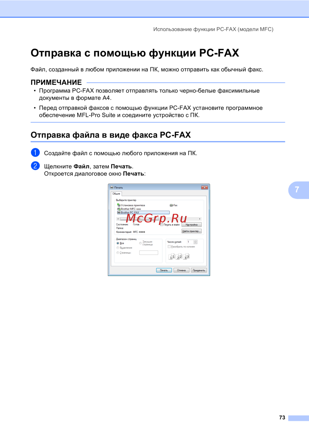 - Использование функции pc fax модели mfc 71 p.6