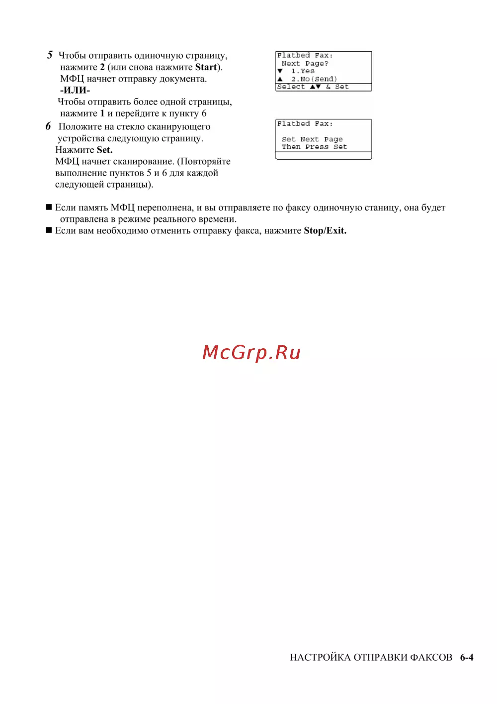 Если память МФЦ переполнена, и вы отправляете по факсу одиночную станицу, она будет