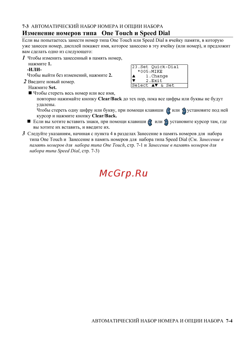Изменение номеров типа One Touch и Speed Dial