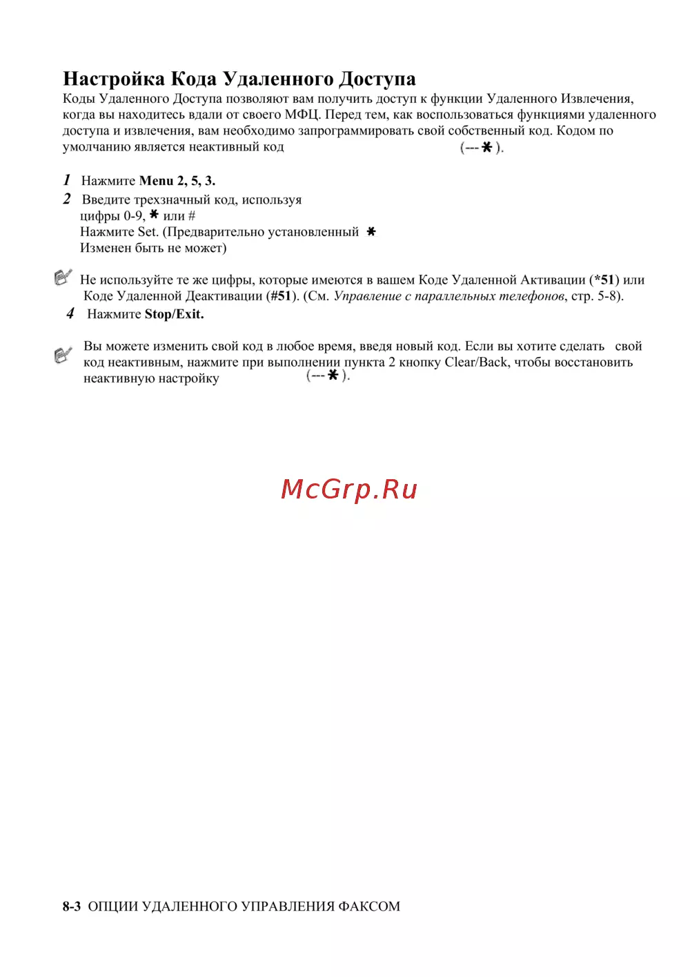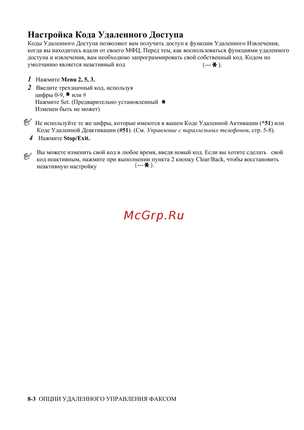 Коде Удаленной Деактивации (#51). (См. Управление с параллельных телефонов, стр. 5-8).