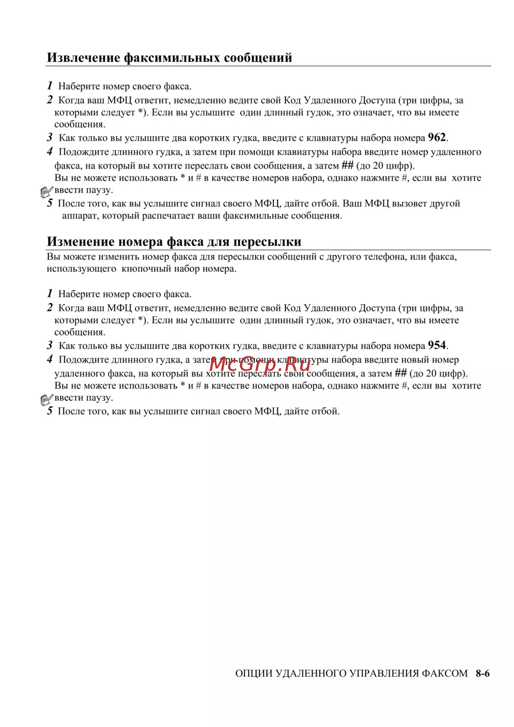 ОПЦИИ УДАЛЕННОГО УПРАВЛЕНИЯ ФАКСОМ 8-6