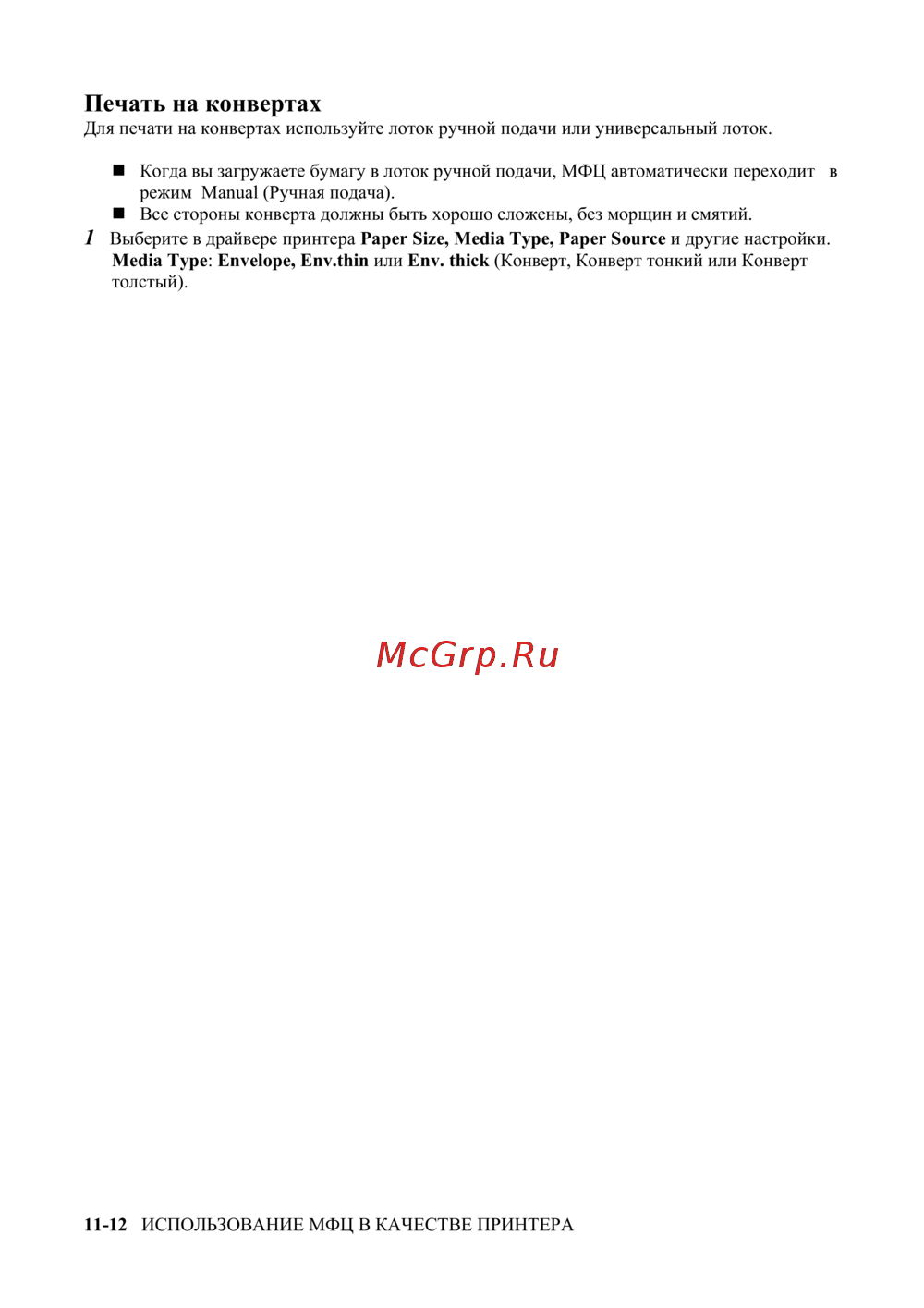 Для печати на конвертах используйте лоток ручной подачи или универсальный лоток.