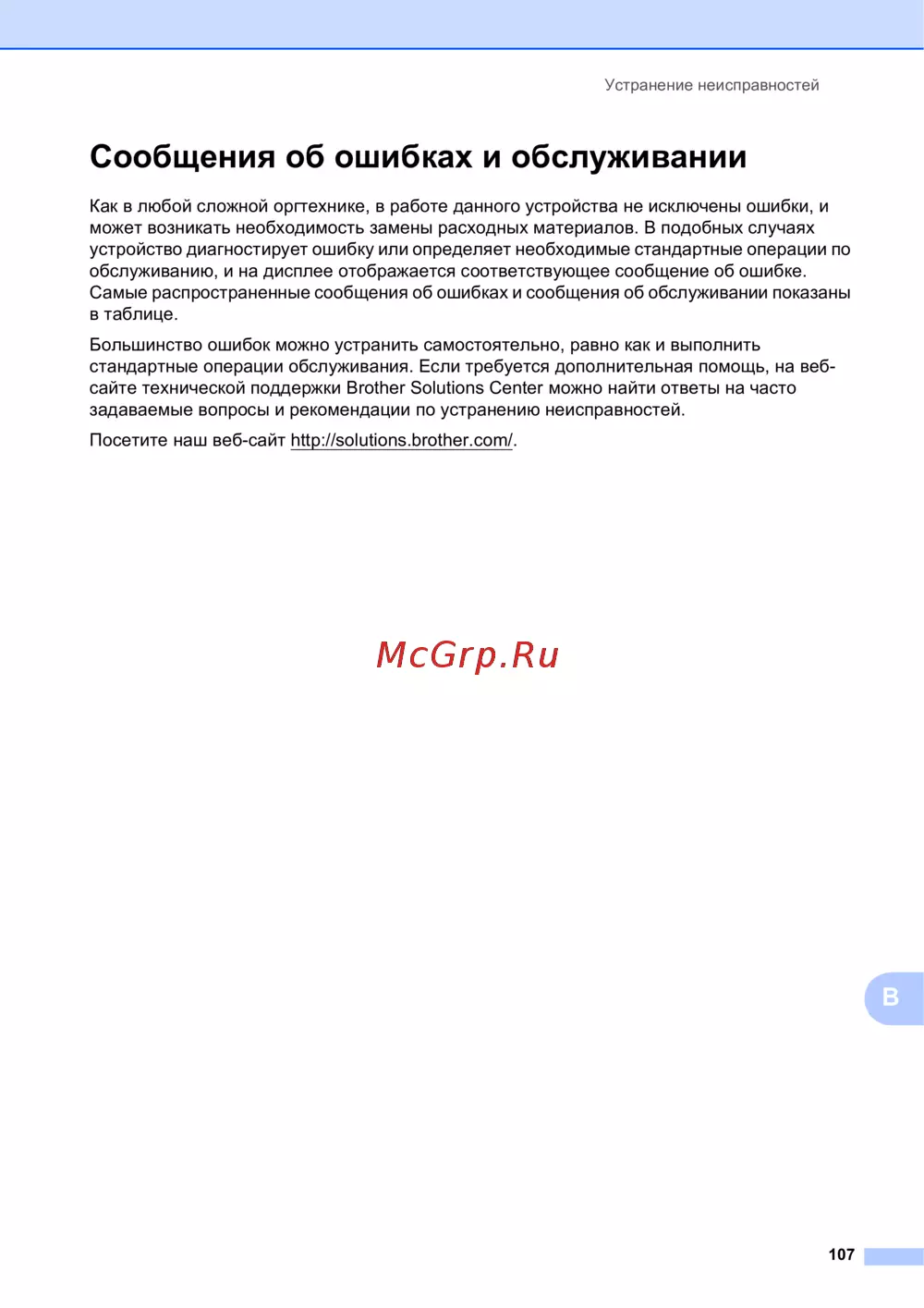 Сообщения об ошибках и обслуживании B