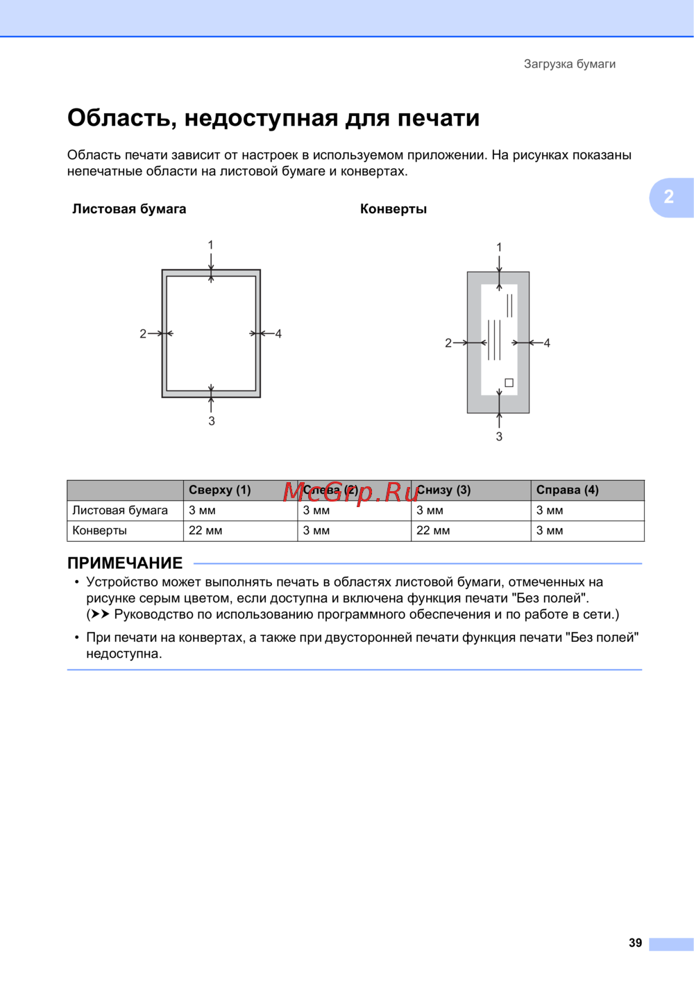 Brother MFC-J3720 [49/229] При печати на конвертах а также при двусторонней печати функция печати без полей недоступна