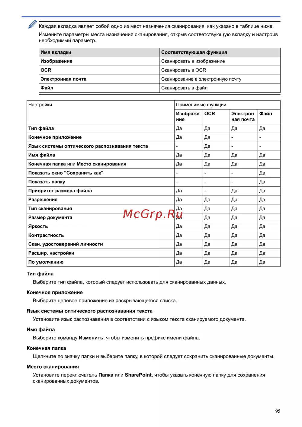 Каждая вкладка являет собой одно из мест назначения сканирования, как указано в таблице ниже.