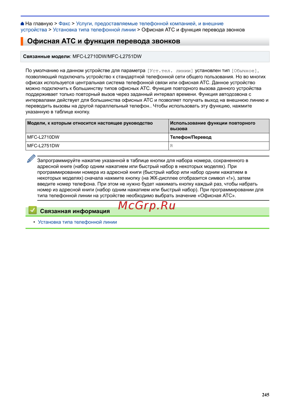 устройства > Установка типа телефонной линии > Офисная АТС и функция перевода звонков