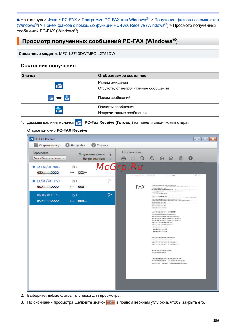 Просмотр полученных сообщений PC-FAX (Windows