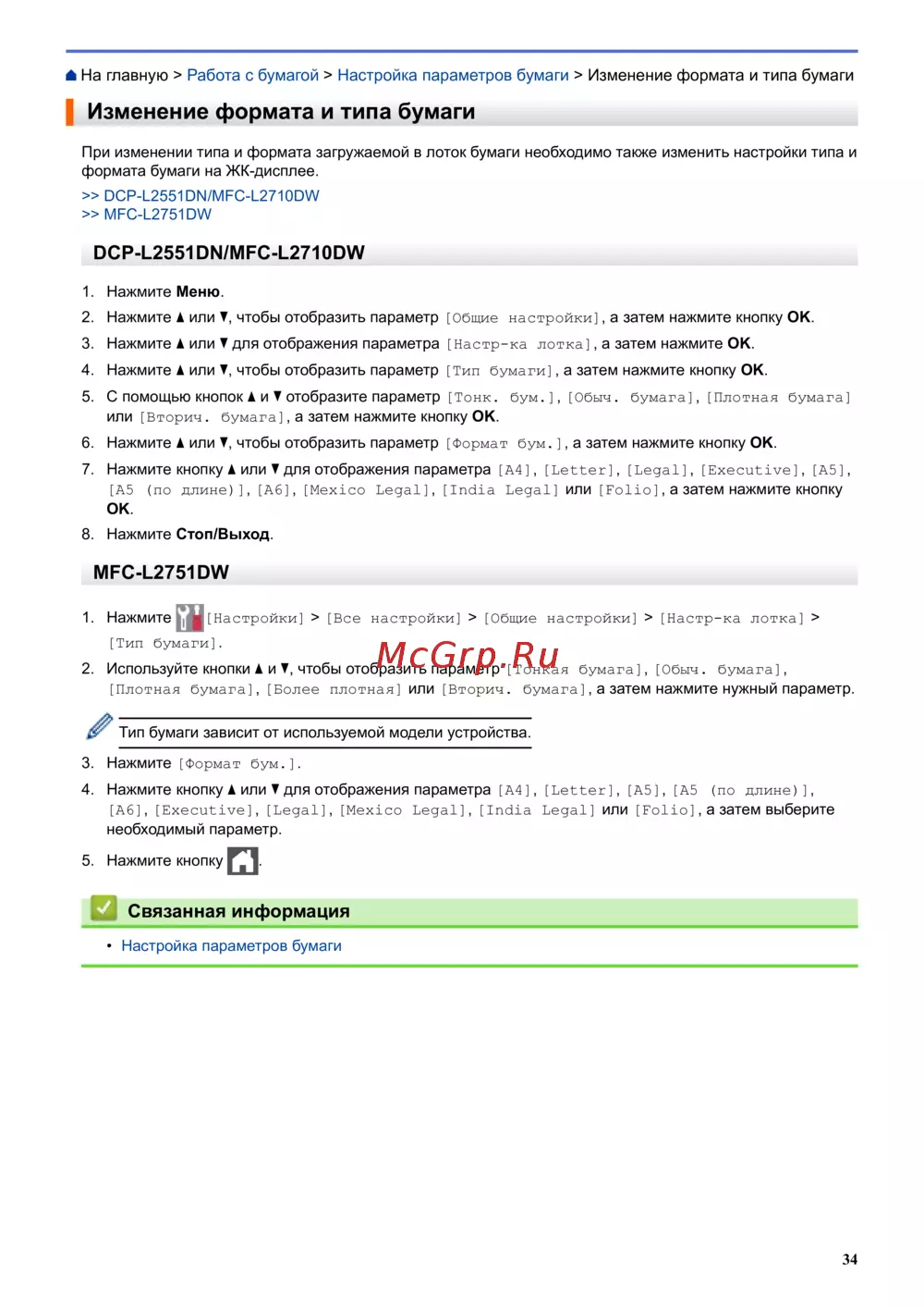 При изменении типа и формата загружаемой в лоток бумаги необходимо также изменить настройки типа и