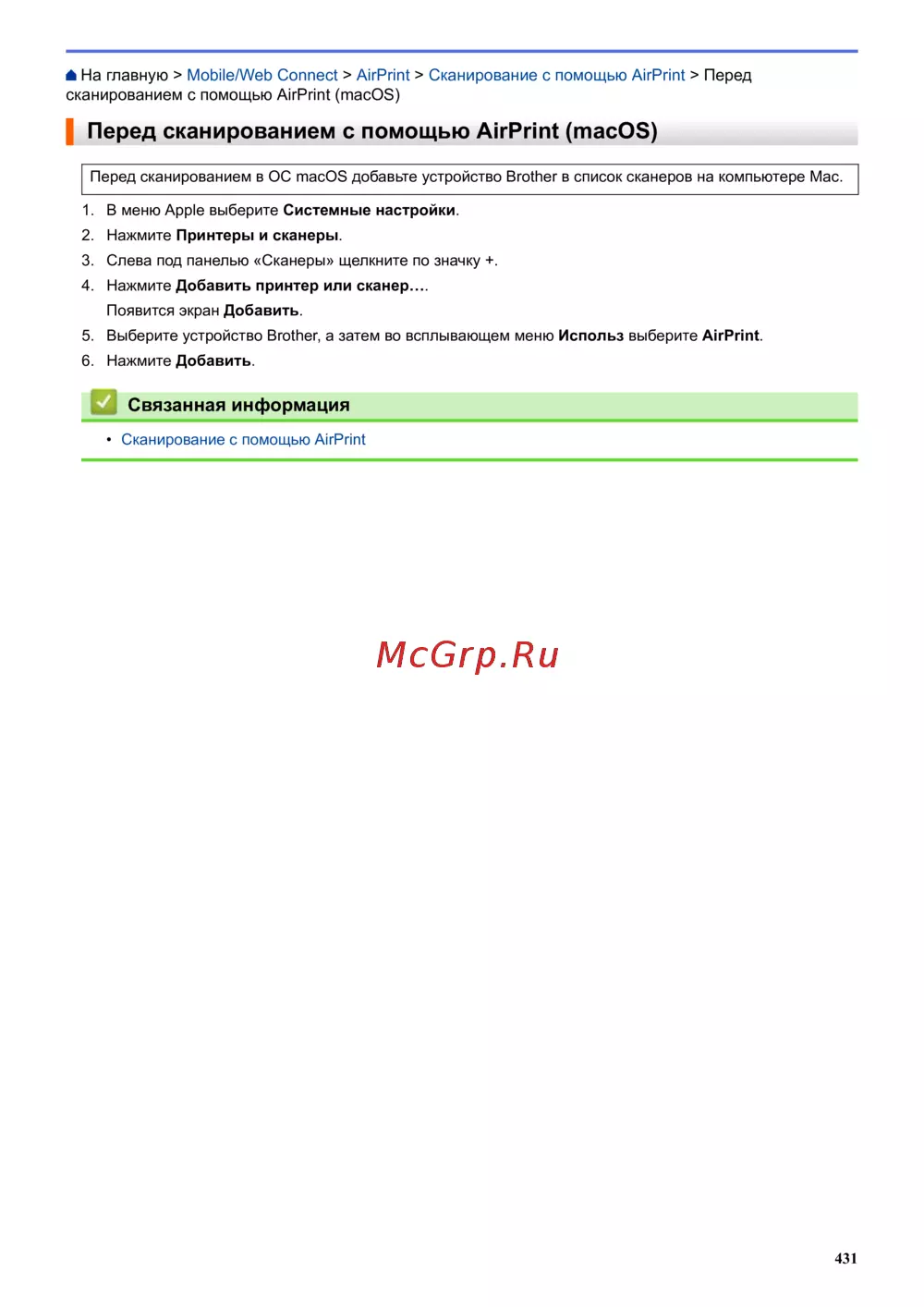 Перед сканированием в ОС macOS добавьте устройство Brother в список сканеров на компьютере Mac.