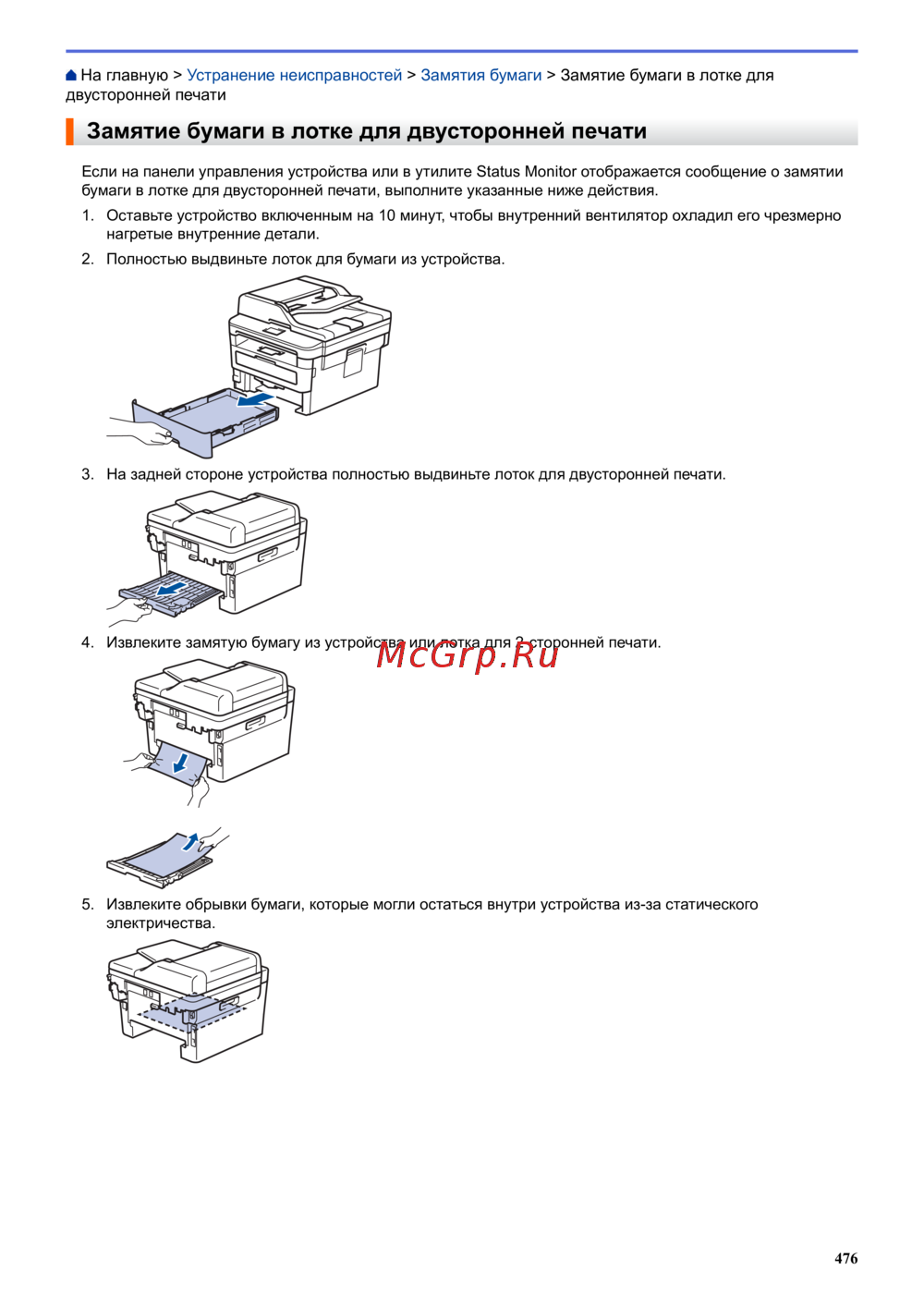 4. Извлеките замятую бумагу из устройства или лотка для 2-сторонней печати.