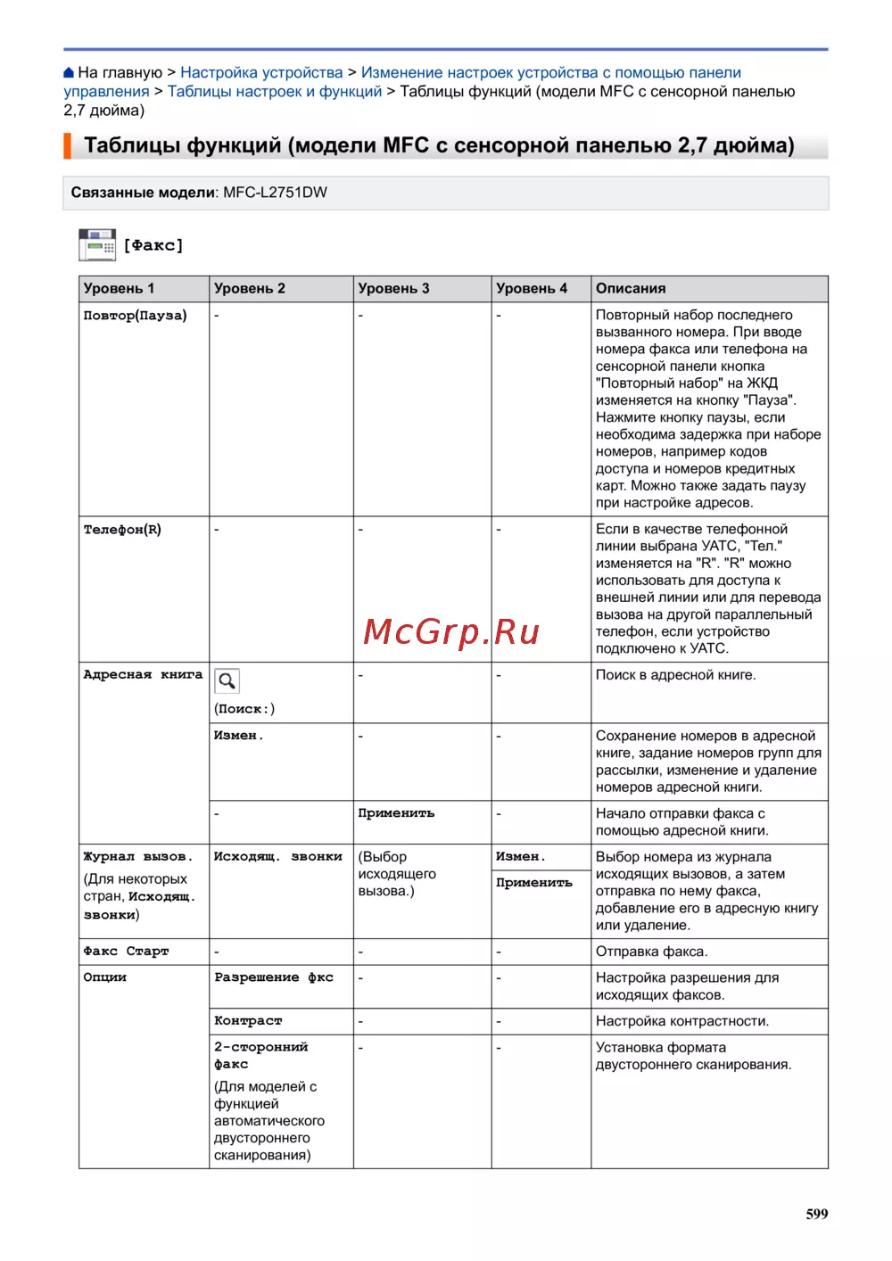 Таблицы функций (модели MFC с сенсорной панелью 2,7 дюйма)