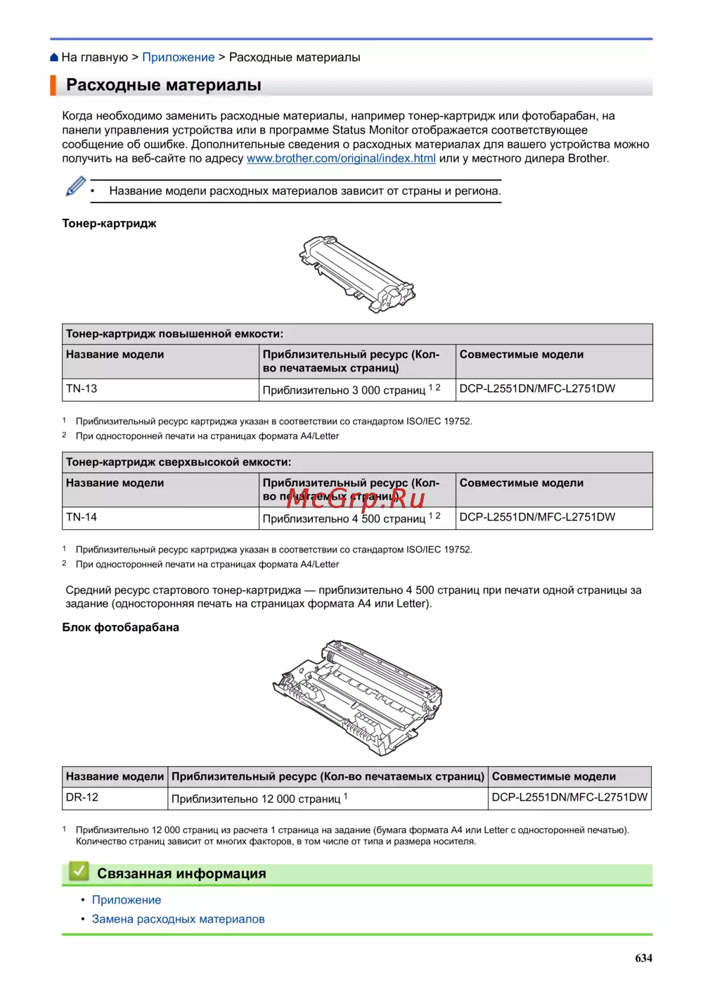 - Когда необходимо заменить расходные материалы например тонер картридж или фотобарабан на панели управления устройства или в программе status monitor отображается соответствующее сообщение об ошибке дополнительные сведения о расходных материалах для вашего устройства можно получить на веб сайте по адресу www brother com original index html или у местного дилера brother p.641