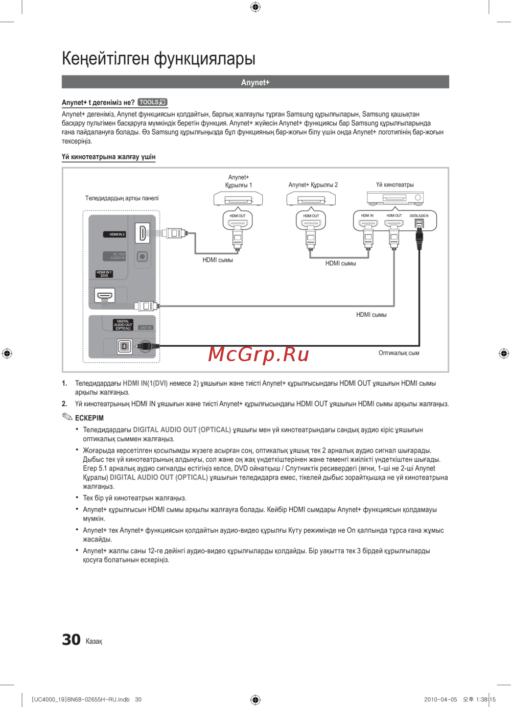 ғана пайдалануға болады. Өз Samsung құрылғыңызда бұл функцияның бар-жоғын білу үшін онда Anynet+ логотипінің бар-жоғын
