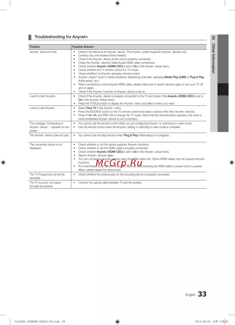 Anynet+ does not work. • Check if the device is an Anynet+ device. The Anynet+ system supports Anynet+ devices only.