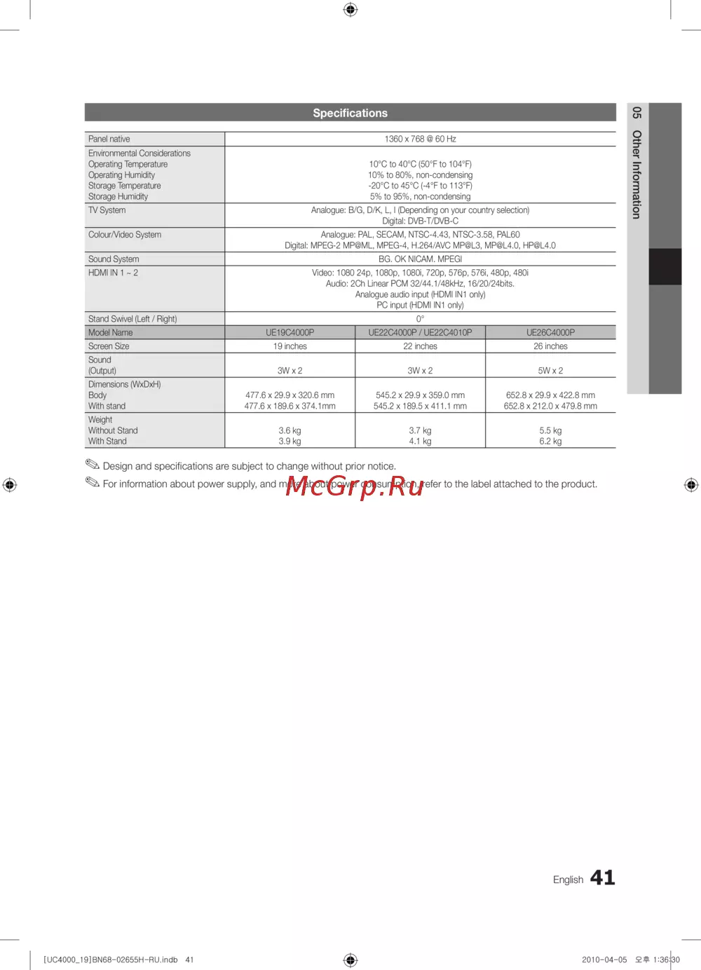 Samsung UE-19C4000 [41/169] Specifications