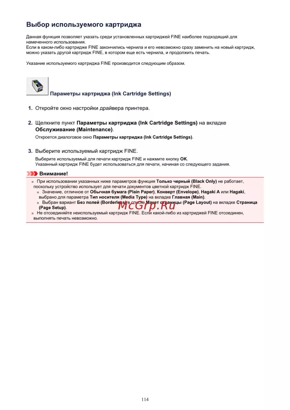 ![Canon PIXMA MX454 [114/897] Щелкните пункт параметры картриджа ink cartridge settings на вкладке обслуживание maintenance](/views2/1938033/page114/bg72.png)