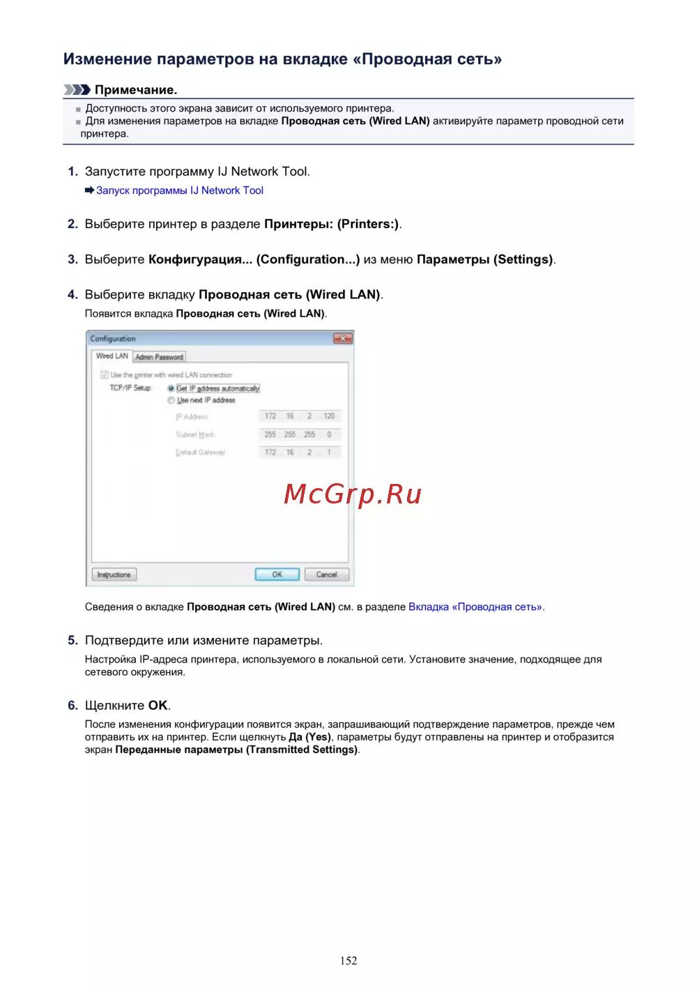Настройка IP-адреса принтера, используемого в локальной сети. Установите значение, подходящее для