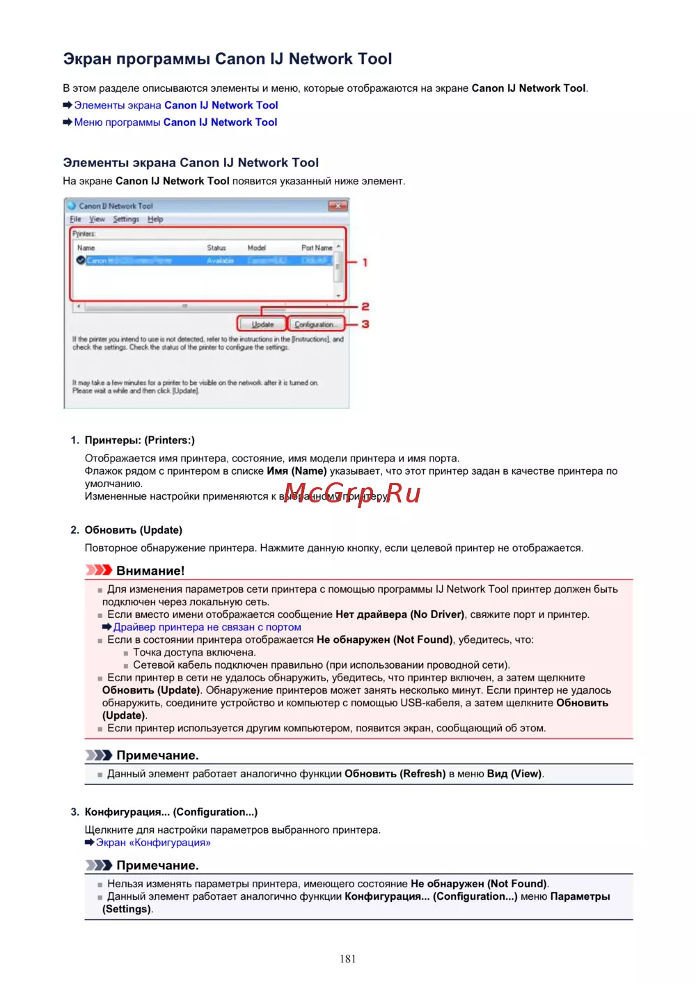 В этом разделе описываются элементы и меню, которые отображаются на экране Canon IJ Network Tool.