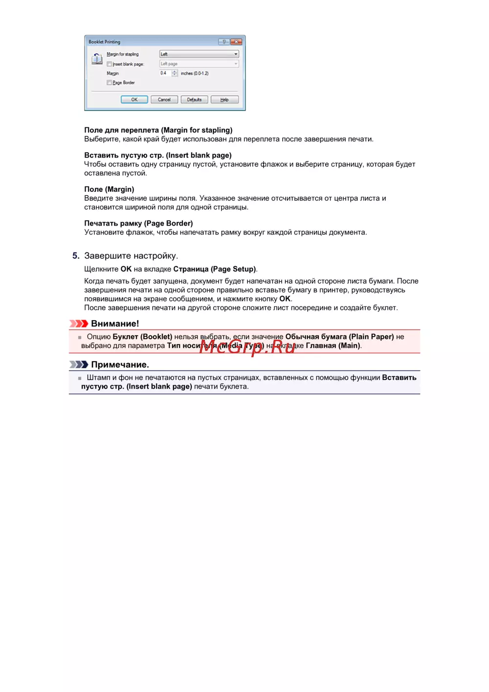 Опцию Буклет (Booklet) нельзя выбрать, если значение Обычная бумага (Plain Paper) не