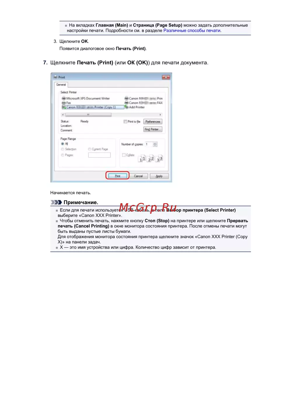 7. Щелкните Печать (Print) (или ОК (OK)) для печати документа.