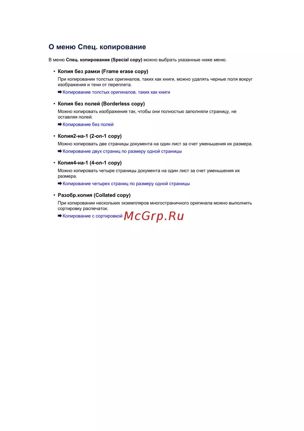 В меню Спец. копирование (Special copy) можно выбрать указанные ниже меню.