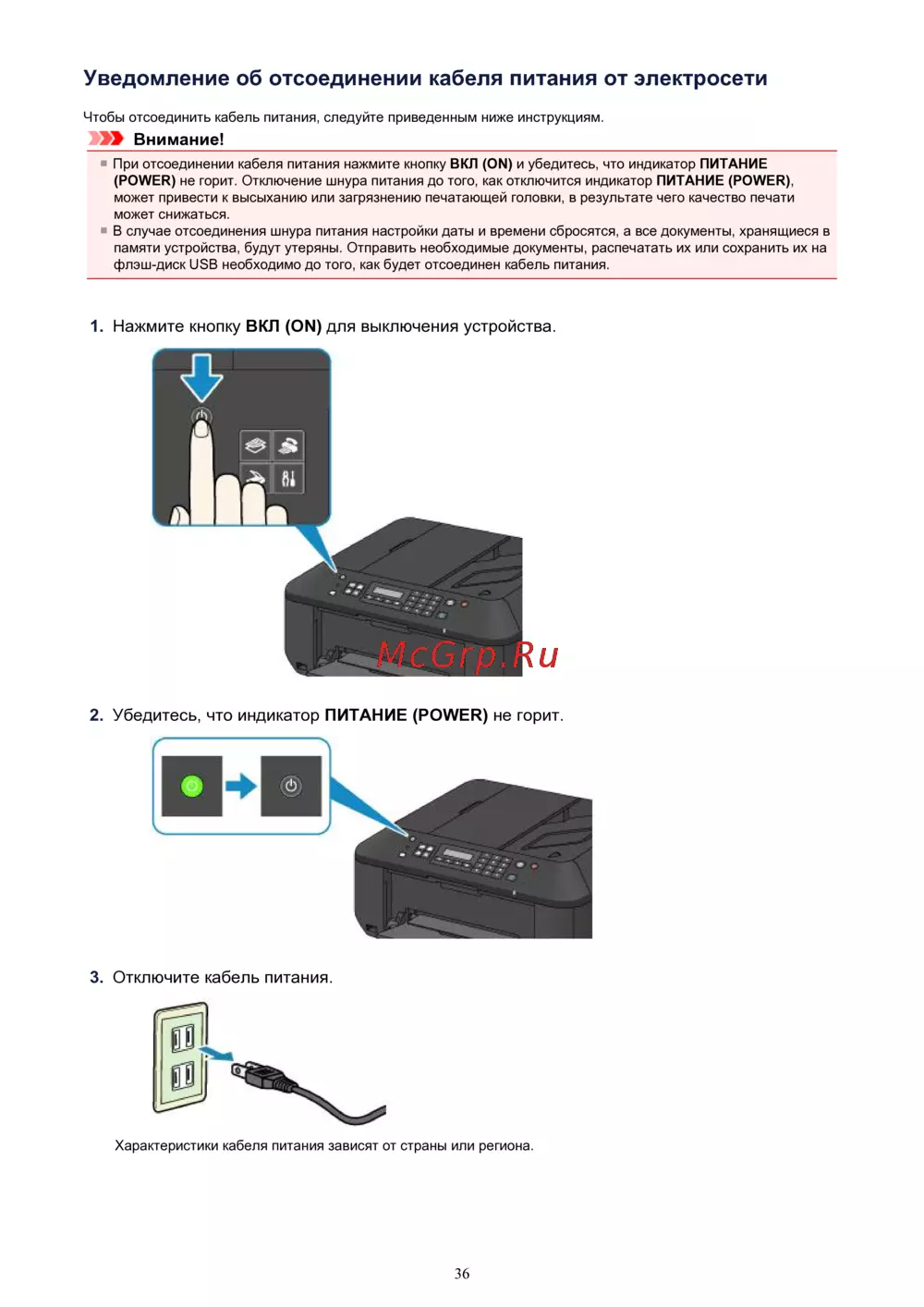 Canon PIXMA MX454 [36/897] Уведомление об отсоединении кабеля питания от электросети